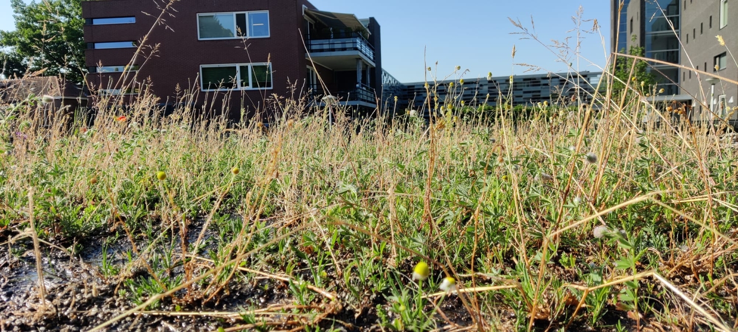 De dit jaar aangelegde dakbloemenweides zien er fantastisch uit! Veertig inheemse soorten planten (waaronder een aantal op de rode lijst) sieren dit deze daken. De wortels staan in een lichtgewicht substraat van o.a. lavameel en puimsteen voor de mineralen. Deze Cruijdthoeckmix is ingezaaid met vaste planten en één- en tweejarigen die zichzelf uitzaaien.