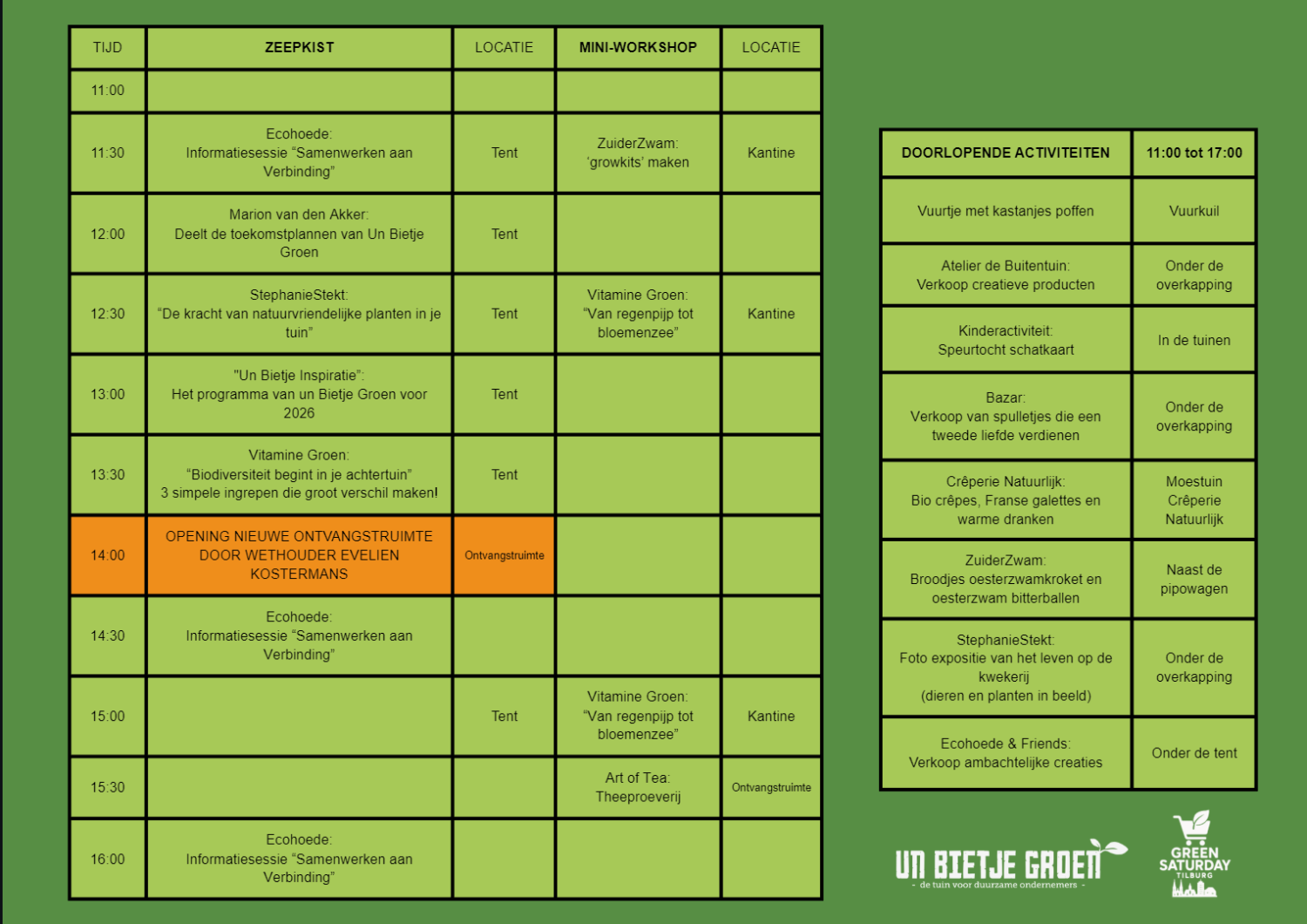 - Mini-workshops van o.a. Vitamine Groen, ZuiderZwam en Art of Tea